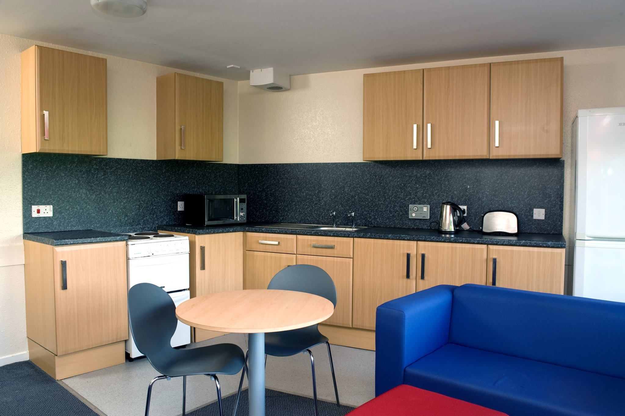 Each flat has a kitchen/living room, most with views across the Links. Kitchens come fully fitted with a cooker, microwave, fridge, sink, toaster, kettle, and basic utensils and crockery. The living rooms sport sofas, tables, and chairs. Thankfully, many members have acquired comfier furniture since moving in. (And the process continues.)