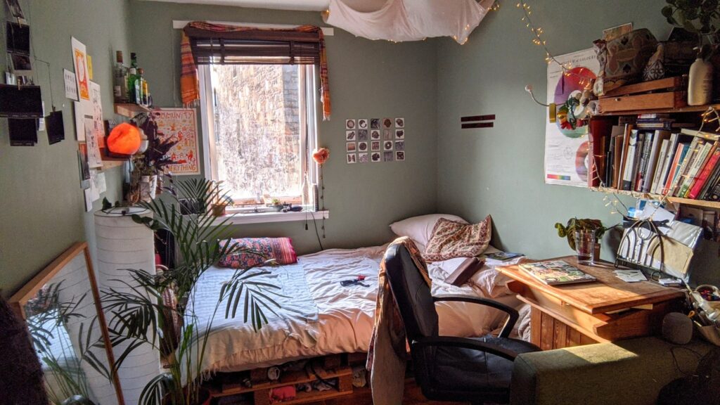 With no landlord breathing down your neck, you can paint the walls how you like, cover the floor in rugs or rip up the carpeting to lay down wood floors, hang artwork from the walls, fit shelves or wall hangings, replace the furniture with your own finds, and customise the place as you see fit. The only rule is that you respect the space you live in and leave it in a great condition for whoever moves in after you. Here are some examples of member’s rooms now – a far cry from the sterile, student-halls feel…
